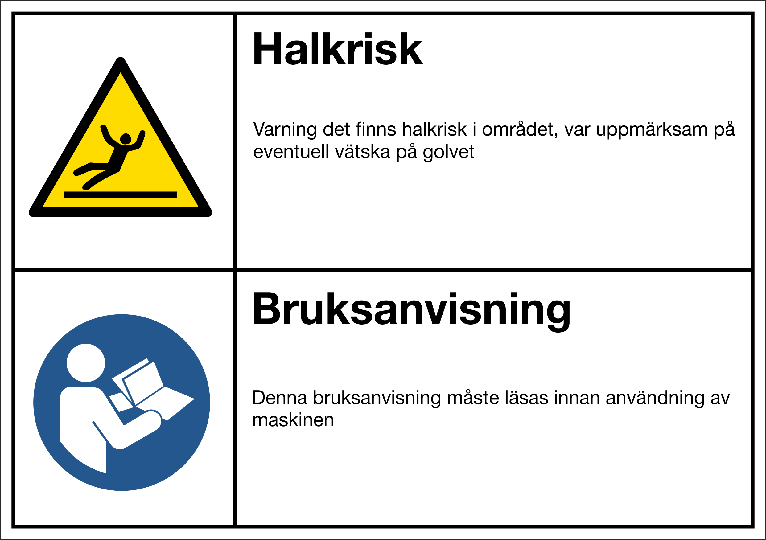 Skylt med pictogram, varning halkrisk, bruksanvisning